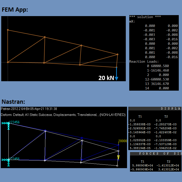 2D stiffness matrix calculation is ported to FemApp solver. Based on a simple tria mesh, displacement and reaction force results are coherent with the ones from Nastran π₯³ Next step is to combine this with the tria mesher in Unity π€