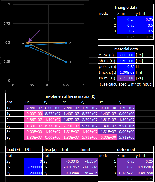 I implemented calculations of 2D stiffness matrix for any given triangle and deformed shape under any loading on Excel. π Next step is to port this to C# and apply it to tria mesh to build global matrices and deformations. π€π€¨